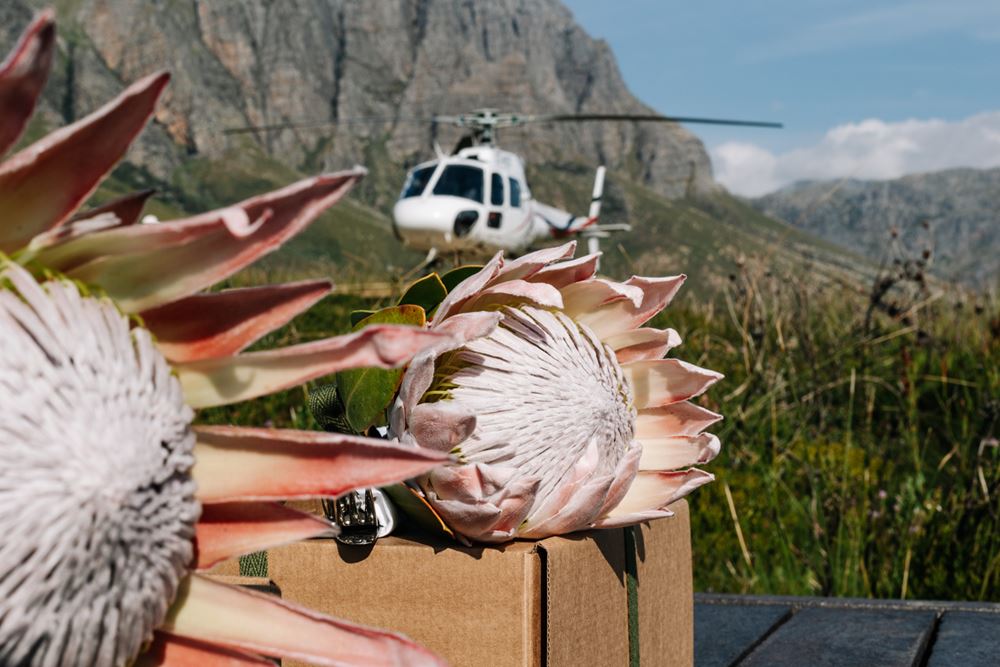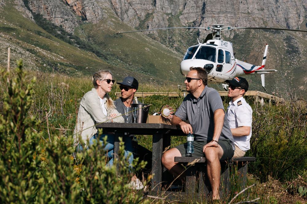 The helicopter flight departs from the V and A Waterfront Helipad . After take off you fly across the Cape Flats towards the majestic Stellenbosch mountains. After flying over the town of Stellenbosch you navigate up to the top of the Jonkershoek Valley where the picnic site is located . Lunch is made up by our own chef Eva to the guests dietary requirements . Enjoy a range of drinks including our world renowned Stellenbosch wines . Those who wish to walk should bring walking shoes and some sun protection. This is a brand new experience and one which we urge all visitors looking for unique experiences to consider. We’re looking forward to welcoming you and we encourage you to bring along the following: sun hat, sunglasses, sunblock, closed-toed shoes, a fully charged phone for pictures, a light jersey and a sense of adventure.